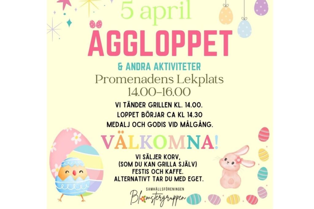 Den 5 april kl. 14.00–16.00 är det dags för det roliga Äggloppet på Promenadens lekplats. Vi tänder grillen kl. 14.00 och erbjuder försäljning av korv som du kan grilla själv, samt festis och kaffe för den som önskar. Alternativt kan du ta med egen matsäck.