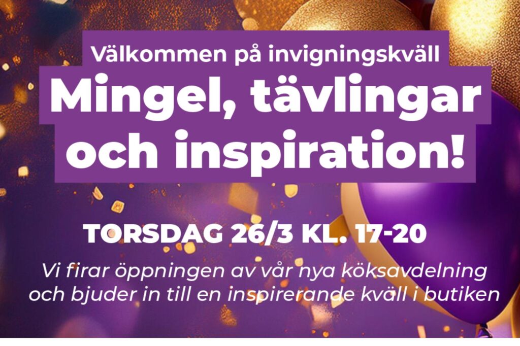 Elon Mönsterås bjuder in till invigningskväll i butiken. Kvällen fylls med inspiration i den nya köksutställningen, köksbingo med chans att vinna fina priser och fiskdamm för alla barn.