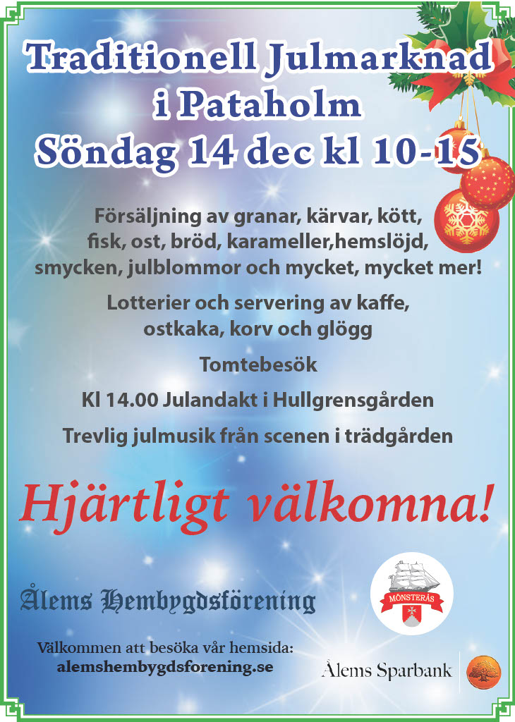 Välkommen till en traditionell julmarknad i Pataholm! Här kan du njuta av en härlig julstämning och handla allt du behöver inför julen.
