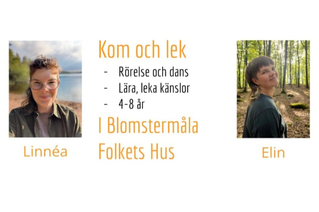 Välkommen till Kom och lek – en snäll, lekfull stund med rörelse, dans och samtal om känslor för barn 4–8 år. Två lördagar i vår på Blomstermåla Folkets Hus!