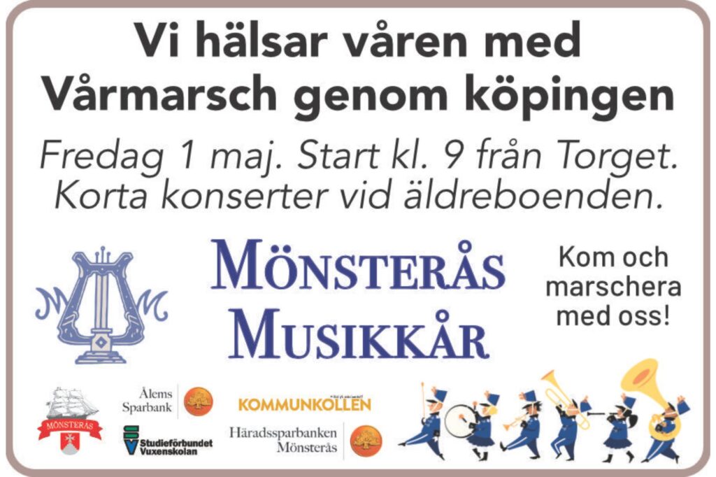 Starta dagen med energisk musik och vårkänslor när Mönsterås Musikkår traditionellt marscherar genom stan. Missa inte den inbjudande vårmarchen som inleds med en stämningsfull konsert på Torget kl 9.