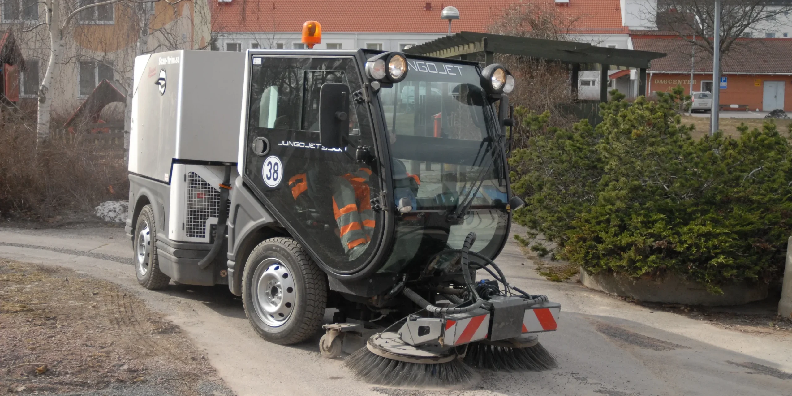 Kommunens allmänna platser som gator, torg och gång- och cykelvägar sopas kontinuerligt vid behov med maskin.